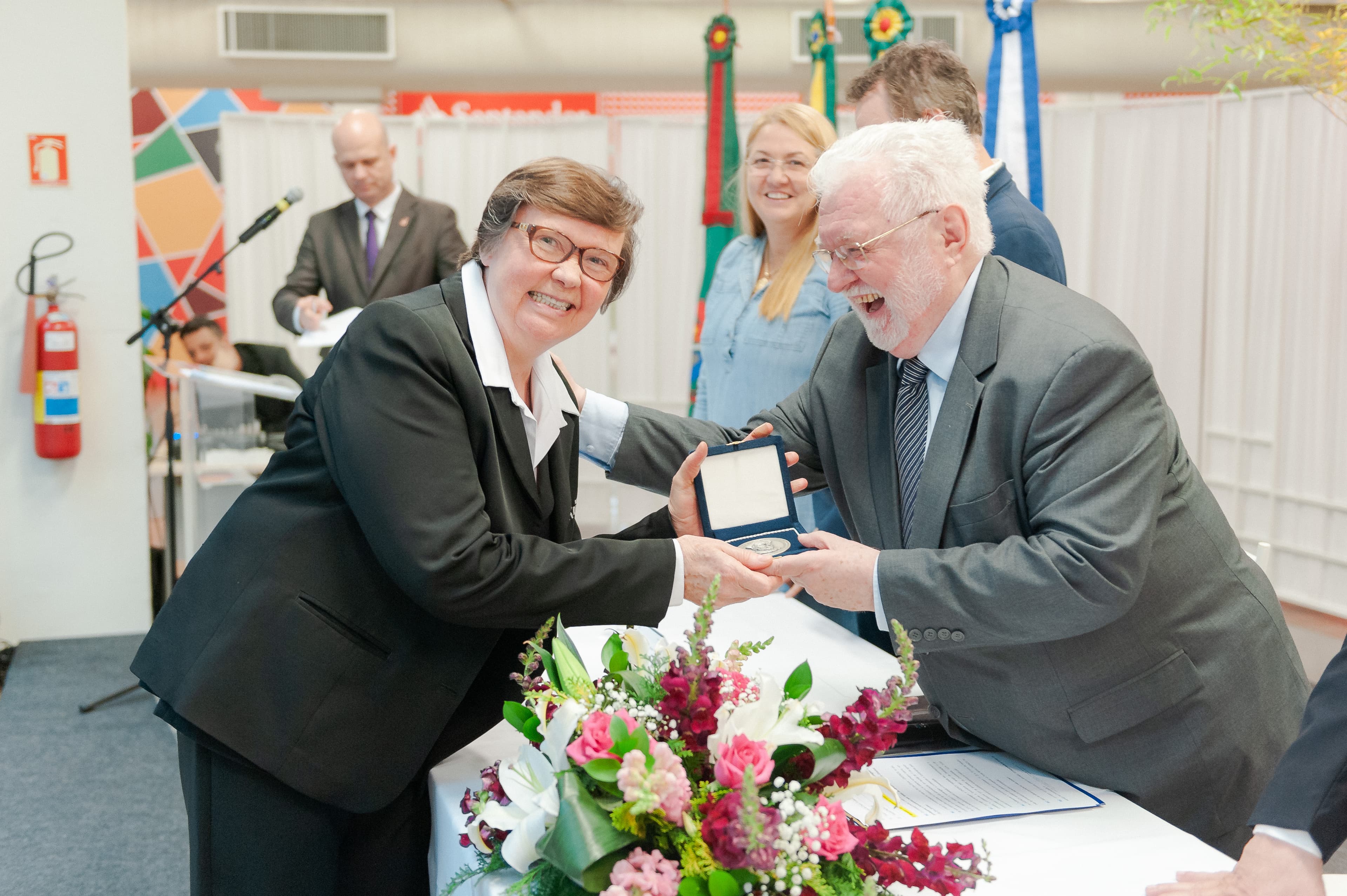 A superintendente da Congregação de Santa Catarina Sandra Pizolatto, a Diretora Geral do Hospital Regina Maria Stoffel (Irmã Cris) e a Diretora Executiva do Hospital Regina Gisele Albaneo, representaram a Instituição na solenidade. “Para nós é uma honra muito grande receber essa homenagem, fruto de parceria com essa instituição tão importante que é a Unisinos para a região. Ficamos muito felizes”, Salientou a Diretora Geral.